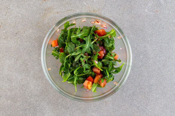 Den übrigen Rucola mit der restlichen Salsa vermengen und den Salat mit 1TL Olivenöl, der übrigen Zitronenschale sowie Salz und Pfeffer nach Geschmack verfeinern. Die Hähnchensandwiches mit dem Salat und den Zitronenspalten servieren.