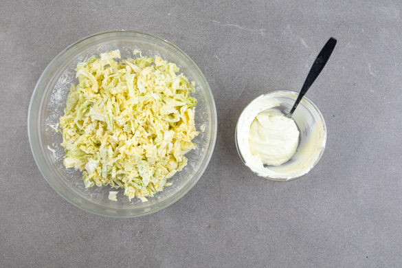 Den Chinakohl in dünne Streifen schneiden. Die 1/2 des Schmands mit dem Zitronensaft und -abrieb, 1–2TL Essig sowie Salz und Pfeffer würzen und mit dem Chinakohl vermengen. Den restlichen Schmand mit der Wasabipaste nach Geschmack und 1 Prise Salz verrühren. Vorsicht, die Wasabipaste ist sehr scharf.