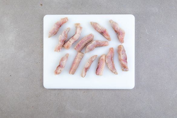 Den Fisch mit etwas Küchenkrepp trocken tupfen. Den Fisch der Länge nach halbieren und quer in ca. 1cm dünne Streifen schneiden. Evtl. vorhandene Gräten mit einer Pinzette entfernen.