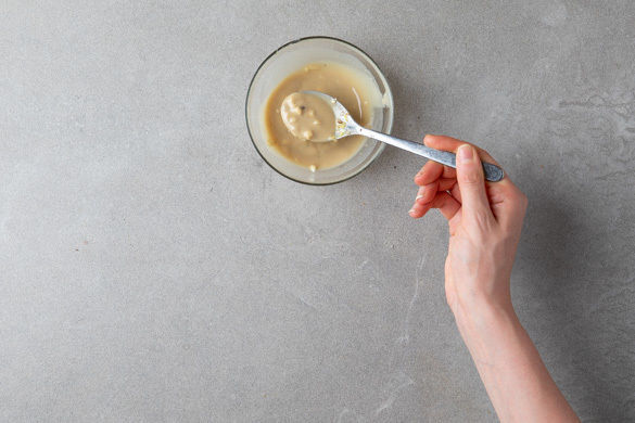 Die Zitronenschale abreiben, dann die Zitrone auspressen. Den Knoblauch schälen, fein würfeln und mit 1–2TL Zitronenschale, 3–4TL Zitronensaft, 1–2EL Wasser und dem Tahini zu einem Dressing verrühren. Mit 1TL Dukkah-Gewürz, 1–2EL Olivenöl sowie Salz und Pfeffer abschmecken. Nach Wunsch kann mehr Dukkah, Zitronensaft oder auch Essig verwendet werden.