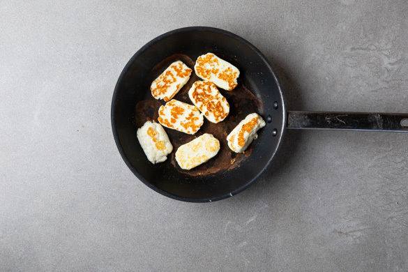 Den Halloumi in einer mittelgroßen Pfanne ohne Zugabe von Fett bei mittlerer Hitze auf jeder Seite 2–3Min. goldbraun anbraten.