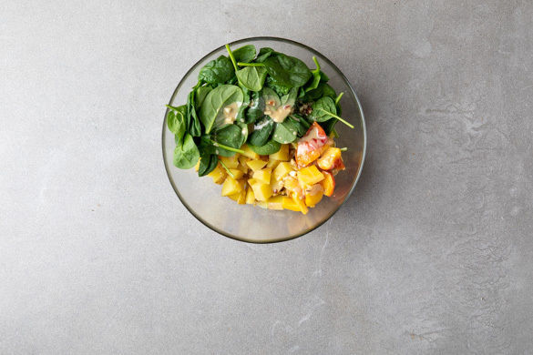 Die 1/2 des Tahini-Dressings gut mit den Kartoffeln, den Pfirsichspalten und dem Spinat vermengen.