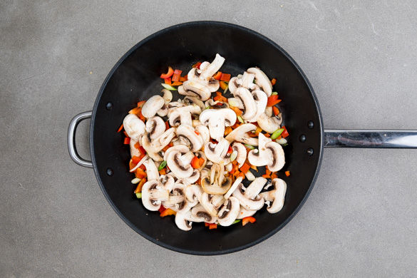 Die Pilze, die Paprika und die 1/2 der Lauchzwiebeln in einer großen Pfanne mit 1–2EL Pflanzenöl bei starker Hitze ca. 2Min. anbraten.