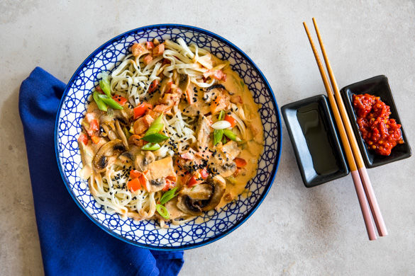 Eine köstliche asiatische Nudelpfanne ist schnell zubereitet, und wenn du diese vegane Variante mit frischen Champignons, roter Paprika und einer pikant-cremigen Kokosmilchsauce probiert hast, wirst du uns sicher zustimmen, dass der Imbiss um die Ecke da nicht mithalten kann.