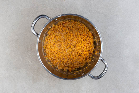 500ml heißes Wasser angießen, die ½ des Brühgewürzes einrühren und die Linsen zugeben. Unter gelegentlichem Rühren 20–25Min. köcheln lassen, bis das Wasser größtenteils aufgesogen ist und die Linsen gar sind, ggf. mehr Wasser zugeben.