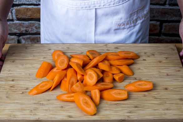 Die Karotten schälen und schräg in ca. 1cm dicke Scheiben schneiden.