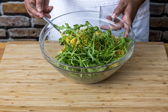 In einem mittelgroßen Topf 800ml Wasser aufkochen. Den Bulgur in das kochende Wasser geben und je nach Schärfewunsch mit dem Currypulver sowie 1 Prise Salz würzen. Den Bulgur abgedeckt 10–12Min. ziehen lassen. Ggf. überschüssige Flüssigkeit abgießen.