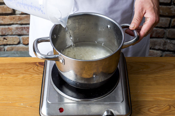 In einem mittelgroßen Topf 800ml leicht gesalzenes Wasser zum Kochen bringen. Den Reis in einem Sieb unter fließendem Wasser abspülen, bis das Wasser klar bleibt. Sobald das Wasser kocht, den Reis bei niedrigster Hitze abgedeckt 10–12Min. kochen, bis das Wasser aufgesogen und der Reis gar ist. Noch ca. 5Min. ohne Hitzezufuhr abgedeckt ziehen lassen.