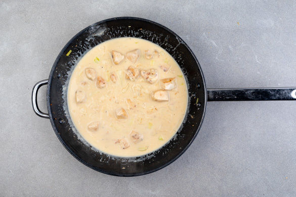 Das Fleisch in einer großen Pfanne mit 2EL Olivenöl bei starker Hitze 1–2Min. rundum scharf anbraten. Die Zwiebeln und den Knoblauch hinzugeben und 1–2Min. mitbraten. Die Temperatur reduzieren und das Fleisch mit 1–2EL Mehl bestäuben. Mit ca. 350ml Pastawasser ablöschen und die Crème fraîche und das Brühgewürz unterrühren.