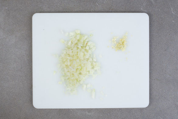 In einem großen Topf ausreichend gesalzenes Wasser für die Pasta zum Kochen bringen. Die Zwiebel schälen, halbieren und in kleine Würfel schneiden. Den Knoblauch schälen und ebenfalls fein würfeln.