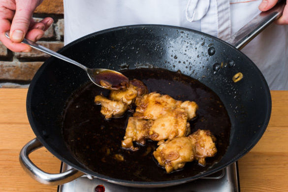 Die Hitzezufuhr erhöhen und das Hähnchen unter gelegentlichem Wenden 3–5Min. karamellisieren. Dabei immer wieder z. B. mit einem Löffel Sauce über das Fleisch träufeln.