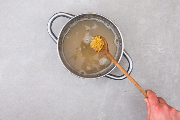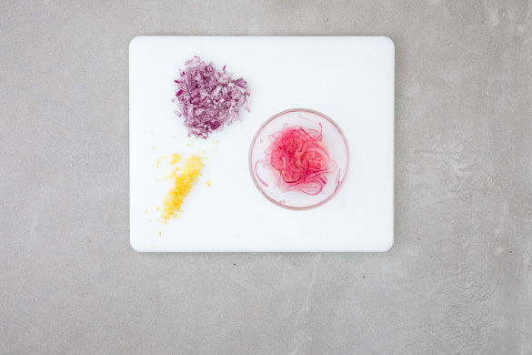 Die Zwiebel schälen und halbieren, eine Hälfte in feine Würfel, die andere Hälfte in feine Streifen schneiden. Die Zitronenschale abreiben, dann die Zitrone halbieren und auspressen. Die Zwiebelstreifen mit 1–2EL Zitronensaft und 1TL Zucker mischen und zum Marinieren beiseitestellen.