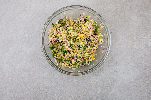 Die Gurke längs vierteln und in feine Würfel schneiden. Die Minzeblätter von den Stängeln zupfen und grob schneiden. Die Oliven fein würfeln. Den Bulgur mit den Zwiebelwürfeln, den Gurkenwürfeln, ca. 2/3 der Minze und den Oliven vermengen.