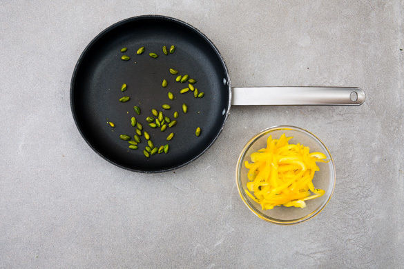 Die Pistazien in einer kleinen Pfanne ohne Fett bei mittlerer Hitze 1–2Min. anrösten. Die Paprika vierteln, entkernen, in dünne Streifen schneiden und unter den Bulgur mischen. Mit Salz und Pfeffer würzen, dann die Hähnchenstreifen mit dem Dip auf dem Bulgursalat anrichten und mit den Zwiebelstreifen, den Pistazien und der restlichen Minze garniert servieren.