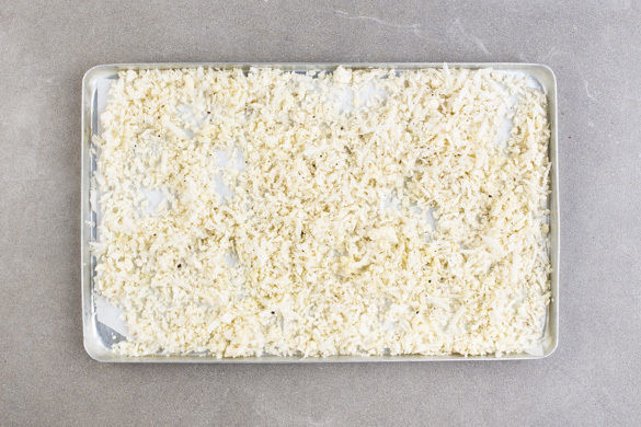 Den Blumenkohl mit einer Küchenreibe grob raspeln und auf einem mit Backpapier ausgelegten Backblech verteilen. Mit 2EL Olivenöl, Salz und Pfeffer vermengen und in den letzten 8Min. zu dem Fleisch und den Linsen in den Ofen geben und backen, bis der Blumenkohlreis gar und an den Ecken leicht gebräunt ist.