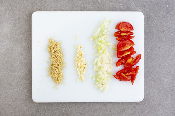 Den Backofen auf 200°C Umluft (220°C Ober-/Unterhitze) vorheizen. Die Zwiebeln, den Ingwer und den Knoblauch schälen und in feine Würfel schneiden. Die Tomaten vierteln, entkernen und in dünne Streifen schneiden.