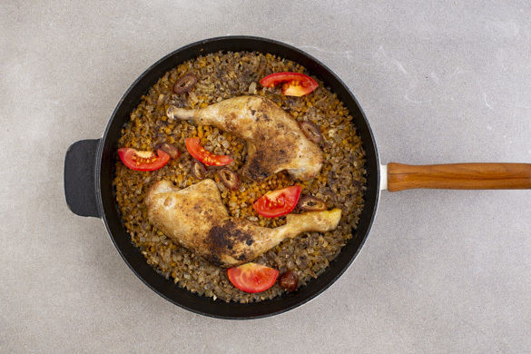 Die orientalische Küche bezaubert uns immer wieder aufs Neue mit ihren komplexen Aromen. Heute servierst du knusprige Hähnchenschenkel, die quasi von selbst im Ofen garen. Dazu gibt es Low-Carb-Blumenkohlreis und ein würziges Linsengemüse mit getrockneten Datteln, Ingwer und Zimt. Frische Tomatenstreifen und Pistazienkerne sind krönendes Beiwerk. Lasst es euch schmecken!