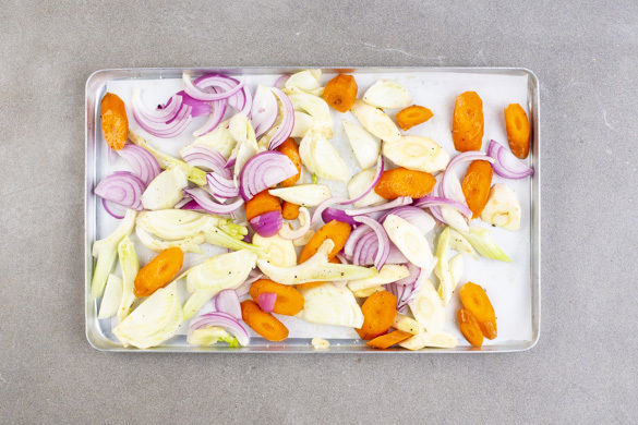 Die Karotten, die Pastinaken, den Fenchel, die Zwiebeln und den Knoblauch mit 1–2EL Olivenöl, Salz und Pfeffer würzen und auf ein zweites mit Backpapier ausgelegtes Backblech geben. Beide Bleche in den Ofen geben und das Gemüse 25–30Min. backen, bis es gar und an den Rändern leicht gebräunt ist.