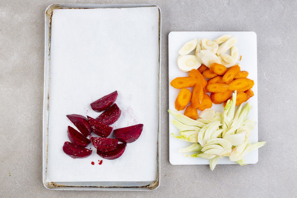 Die Rote Bete schälen, halbieren, in ca. 1cm breite Spalten schneiden, mit 2EL Olivenöl, Salz und Pfeffer würzen und auf ein mit Backpapier belegtes Backblech geben. Die Karotten und Pastinaken schälen und schräg in ca. 1cm große Stücke schneiden. Den Fenchel längs halbieren und in ca. 1cm dicke Scheiben schneiden, den Strunk entfernen. Das Fenchelgrün beiseitelegen.