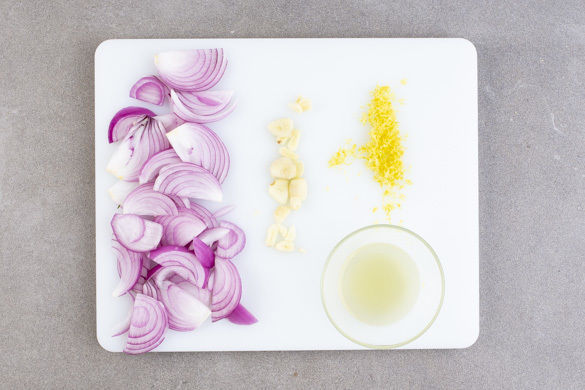Den Backofen auf 220°C Umluft (240°C Ober-/Unterhitze) vorheizen. Die Zwiebeln schälen, halbieren und in dünne Spalten schneiden. Den Knoblauch schälen und in dünne Scheibchen schneiden. Die Zitronenschale abreiben, dann die Zitronen halbieren und auspressen.