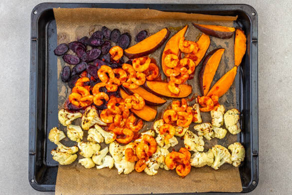 Den Backofen auf 240°C (220°C Umluft) vorheizen. Den Blumenkohl in mundgerechte Röschen zerkleinern. Die Süßkartoffel ggf. schälen und in ca. 1cm breite Spalten schneiden. Die Karotten ggf. schälen und schräg in dünne Scheiben schneiden. Die Garnelen in einem Sieb kalt abspülen und abtropfen lassen, dann trocken tupfen.