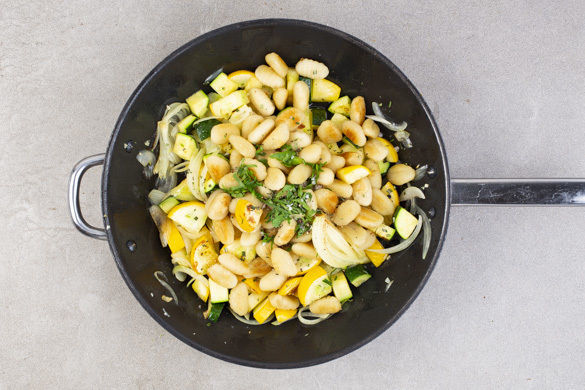 Die Zucchini in einer großen Pfanne mit 1–2EL Olivenöl bei mittlerer Hitze 1–2Min. anbraten. Die Zwiebeln und den Knoblauch 1Min. mitbraten. Das Gemüse aus der Pfanne nehmen. Die Gnocchi mit 1–2EL Öl knusprig anbraten. Das Gemüse zurück in die Pfanne geben und mit den Kräutern, Salz und Pfeffer würzen. Das Fleisch mit der Sauce und den Gnocchi servieren.
