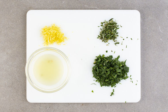 Die Zitronenschale abreiben, dann die Zitrone halbieren und auspressen. Die Petersilie samt Stängeln fein hacken. Die Rosmarinnadeln von den Stängeln zupfen und fein schneiden.