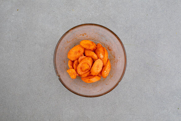Die Karotten ggf. schälen und in dünne Scheiben schneiden. Die Karotten mit 1EL Olivenöl sowie je 1 kräftigen Prise Salz und geräuchertem Paprikapulver vermengen.