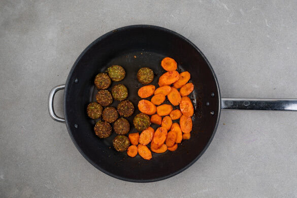 Die Karotten in einer großen Pfanne mit 2EL Olivenöl bei mittlerer Hitze jeweils 2–3Min. von beiden Seiten braten. Dann die Falafeln dazugeben und 5–6Min. mitbraten, bis die Falafeln goldbraun und die Karotten weich sind. Bis zum Servieren warm halten.
