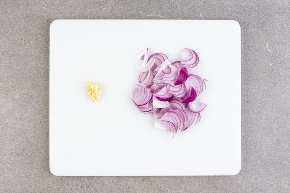 Die Zwiebeln schälen, halbieren und in feine Streifen schneiden. Den Knoblauch schälen, halbieren und fein würfeln.