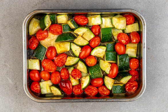 Die Zucchini in ca. 2cm große Würfel schneiden. Die Zucchini und die Tomaten in einer Auflaufform mit 4EL Olivenöl, 2EL Balsamicoessig sowie ½TL Salz und 1 Prise Pfeffer vermengen und im Backofen 20–25Min. rösten, bis die Tomaten weich sind und aufplatzen. Bis zum Servieren warm halten (siehe Kochtipp).