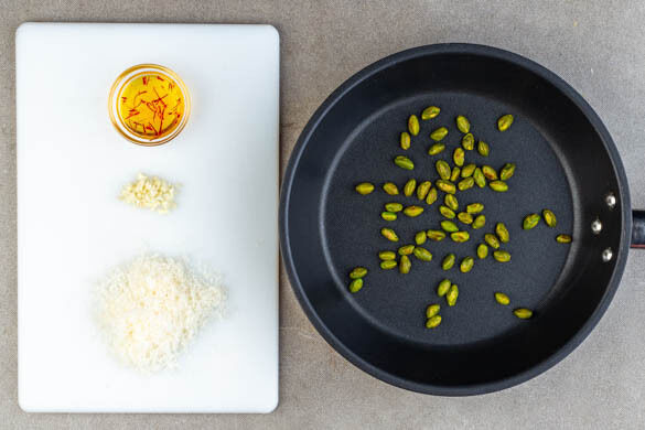 Den Backofen auf 220°C (200°C Umluft) vorheizen. Das Brühgewürz in 750ml heißem Wasser auflösen. Den Safran mit einem Löffel zerdrücken, mit 1EL heißem Wasser vermengen und beiseitestellen. Den Knoblauch schälen und fein würfeln. Den Käse fein reiben. Die Pistazien in einer mittelgroßen Pfanne ohne Öl in 2–4Min. goldbraun anrösten, dann beiseitestellen. Die Pfanne aufbewahren.