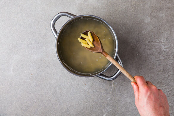 Die Pasta in das kochende Wasser geben und in 7–9Min. bissfest kochen. In ein Sieb abgießen und abtropfen lassen.