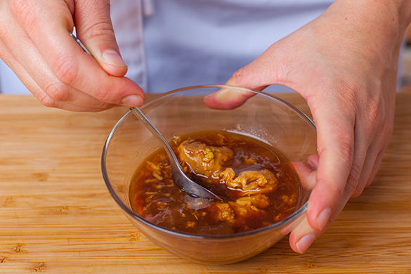Den Backofen mit Grillfunktion auf 250°C vorheizen. Den Knoblauch schälen und fein würfeln. Die Erdnussbutter mit der Sweet-Chili-Sauce, der Sojasauce und der Gewürzmischung glatt rühren, dann den Knoblauch und 80ml Wasser unterrühren.