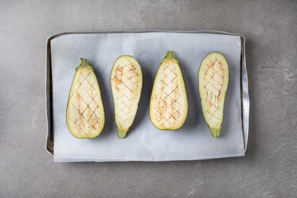 Die Auberginen längs halbieren und das Innere mit einem Messer kreuzartig einschneiden. Dabei die äußere Haut der Auberginen nicht verletzen.