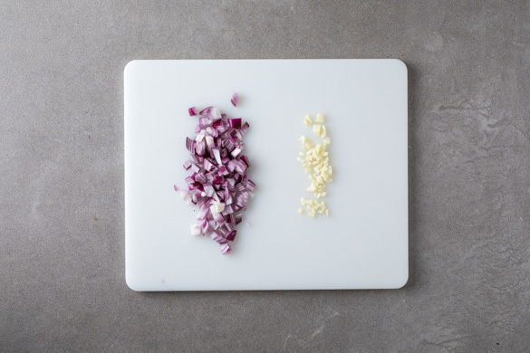 Die Zwiebel schälen, halbieren und in feine Würfel schneiden. Den Knoblauch schälen und ebenfalls fein würfeln.