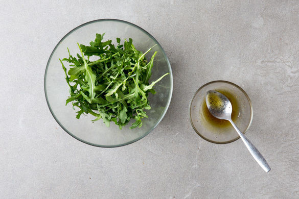 Den Rucola mit je 2TL Olivenöl und Essig sowie 1 Prise Salz und Pfeffer würzen. Die Linsen-Tomaten-Sauce auf den Auberginen verteilen, dann jede Hälfte mit ca. 2EL Joghurt und einigen Aprikosenstückchen garnieren. Die gefüllten Auberginen mit dem Rucolasalat servieren.