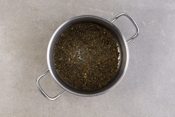 Den Backofen mit Grillfunktion auf 250°C vorheizen. Die Linsen in einem Sieb mit kaltem Wasser abspülen und in einem mittelgroßen Topf mit 1L Wasser bei starker Hitze aufkochen. Die Hitze reduzieren und die Linsen 20–25Min. sanft köcheln lassen, bis sie weich sind.