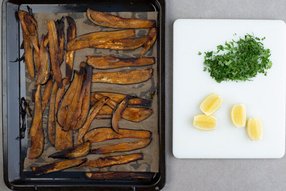 Die Auberginen aus dem Ofen nehmen und etwas abkühlen lassen. Tipp: Evtl. ausgetretene Bratsäfte in die Pilzsauce rühren. Die Petersilie samt Stängeln grob hacken. Die Zitrone in Spalten schneiden.