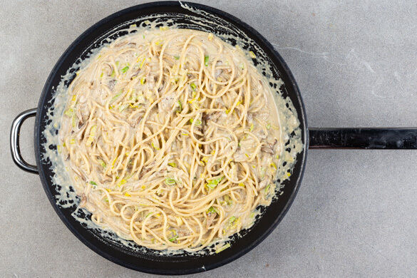 Die Austernpilze in dünne Streifen zupfen und mit dem Lauch in einer großen Pfanne mit 2EL Olivenöl bei mittlerer Hitze ca. 5Min. anbraten. Die Cashewsauce unterrühren und ggf. mit Salz und Pfeffer nachwürzen. Die Pfanne vom Herd nehmen.