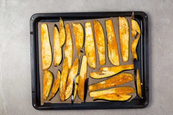 Den Backofen auf 220°C (200°C Umluft) vorheizen. 3½EL Olivenöl mit dem Paprikapulver, 1TL Salz und 1 Prise Zucker verrühren. Die Aubergine längs halbieren, dann der Länge nach in 2–3mm dünne Scheiben schneiden und diese mit dem Würzöl bestreichen. Auf einem mit Backpapier ausgelegten Blech in 15–18Min. goldbraun garen. Am besten für die letzten 2Min. den Grill zuschalten.