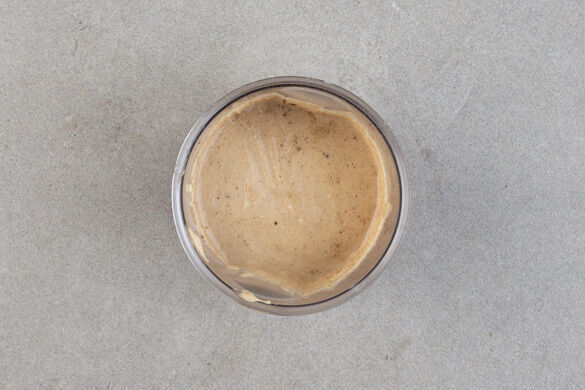 In einem mittelgroßen Topf ausreichend gesalzenes Wasser für die Pasta zum Kochen bringen. Den Knoblauch schälen und halbieren. Mit den Cashews, den Hefeflocken, dem Steinpilzpulver, dem Violife Creamy, 50ml Wasser, ½TL Salz und 1 kräftigen Prise Pfeffer in einem hohen Gefäß pürieren.