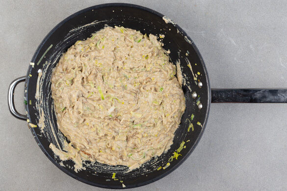 Die Austernpilze in dünne Streifen zupfen und mit dem Lauch in einer großen Pfanne mit 1EL Olivenöl bei mittlerer Hitze ca. 5Min. anbraten. Die Cashewsauce unterrühren und ggf. mit Salz und Pfeffer nachwürzen. Die Pfanne vom Herd nehmen.