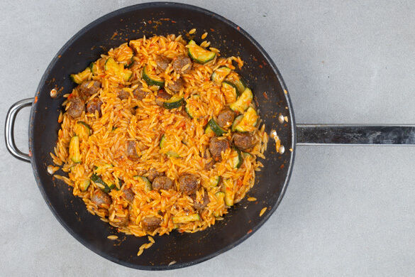 Mit 200ml heißem Wasser ablöschen, die Risoni und die ½ des Brühgewürzes unterrühren und alles abgedeckt bei mittlerer Hitze 12–14Min. köcheln lassen, bis die Risoni bissfest sind. Zwischendurch prüfen und bei Bedarf etwas mehr heißes Wasser hinzugeben. Die Pfanne vom Herd nehmen.