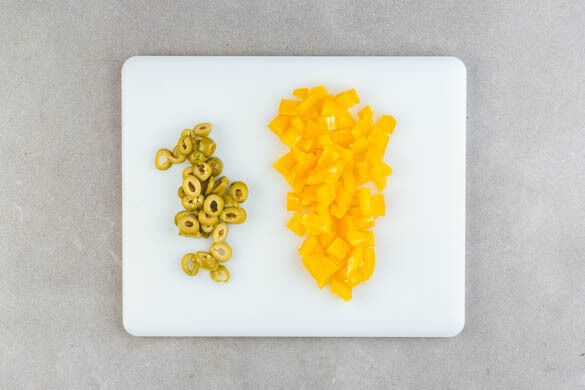 Die Paprika vierteln, entkernen und in mundgerechte Stücke schneiden. Die Oliven in dünne Ringe schneiden.