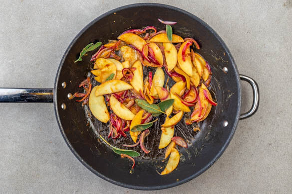 Die Zwiebeln und die Äpfel in einer mittelgroßen Pfanne mit 3EL Butter bei mittlerer Hitze in 3–4Min. glasig braten. 2TL Senf, die Salbeiblätter und die Misopaste hinzugeben und 2–3Min. weiterbraten. Mit 3EL Essig ablöschen und vom Herd nehmen.