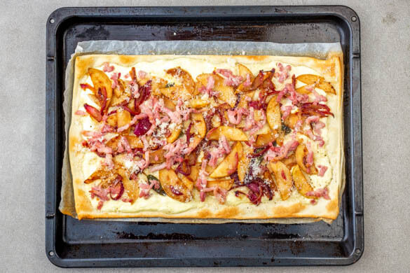 Die Teige mit dem Papier nach unten auf zwei Backbleche ausrollen und gleichmäßig mit der Crème fraîche bestreichen, dabei einen Rand von ca. 1cm freilassen. Mit je 1 kräftigen Prise Salz und Pfeffer würzen, dann die Apfel-Zwiebel-Mischung darauf verteilen und mit dem Speck bestreuen.