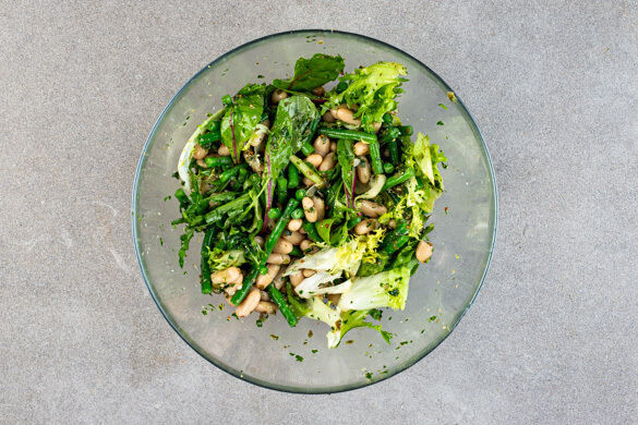 Heute servierst du einen Low-Carb-Salat, der das Goldkind der spanischen Küche feiert: Serrano! Der edle Schinken wird erst in Meersalz gelagert, bevor er bei steigender Temperatur an der Luft reift. So wird er besonders mager und aromatisch. Unseren gustativen Festmarsch lotsen al dente gegarte grüne Bohnen, gebackene Zucchinistreifen und samtige Cannellinibohnen in Kapern-Dressing – eine würdige Begleitung!