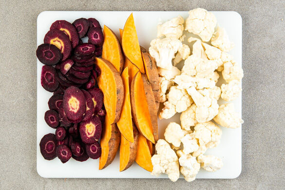 Den Backofen auf 240°C (220°C Umluft) vorheizen. Den Blumenkohl in mundgerechte Röschen zerkleinern. Die Süßkartoffeln ggf. schälen und in ca. 1cm breite Spalten schneiden. Die Karotten ggf. schälen und schräg in dünne Scheiben schneiden.