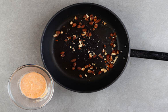 Die Sriracha-Sauce mit der ½ des Knoblauchs oder mehr, dem restlichen Limettensaft und 2EL veganer Mayonnaise verrühren. Mit der Limettenschale und Salz abschmecken. Die Mandeln grob hacken und in einer mittelgroßen Pfanne ohne Zugabe von Fett bei mittlerer Hitze 1–2Min. goldbraun anrösten. Vorsicht, sie können schnell zu dunkel werden. Auf einem Teller beiseitestellen.